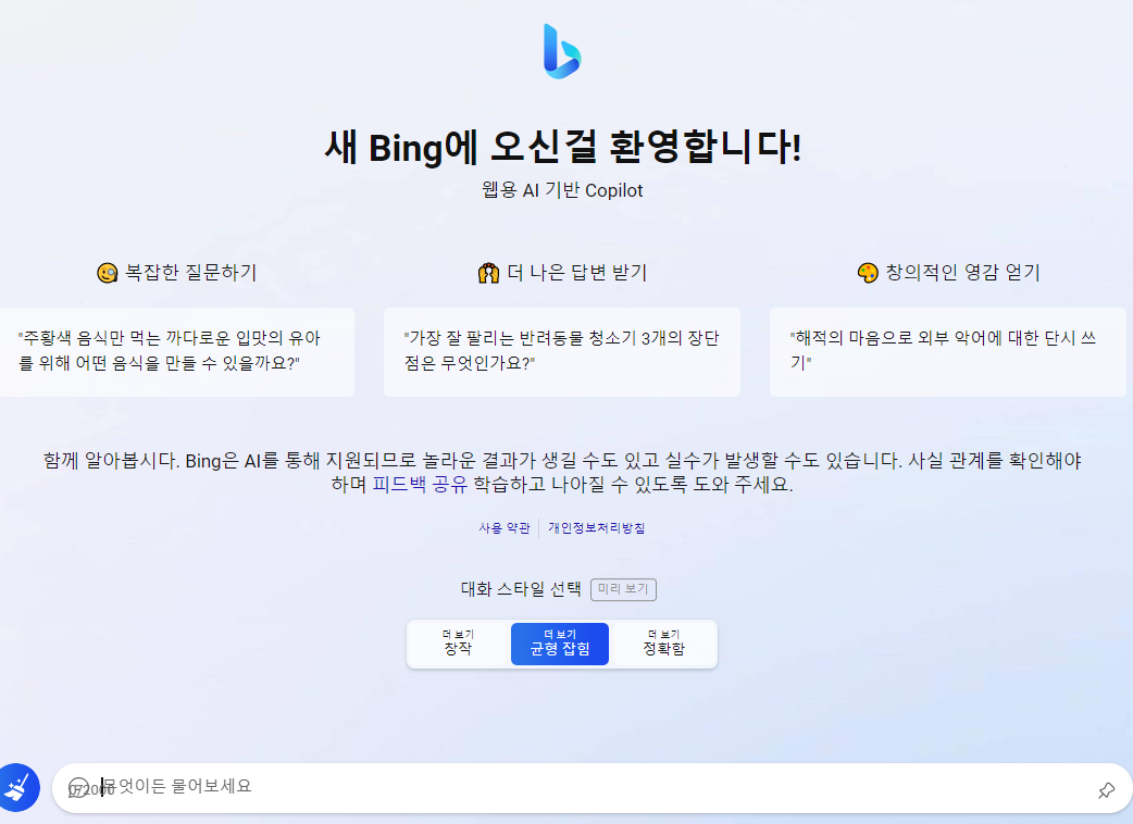 엣지에서 빙 챗 화면으로 접속된것으로 확인됩니다. 현재의 빙 챗봅의 모습을 확인하실 수 있는데요. 이제부터 바로 빙 챗봇을 사용하실 수 있습니다. 하단의 무엇이든 물어보세요 입력란에 자신이 원하는 질문을 쓰게 되면 챗 GPT or 심심이 처럼 챗봉이 알아서 답변하는 시스템입니다.