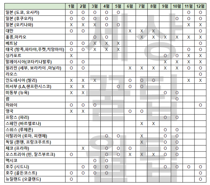 여행은 언제나 즐겁지만 떠나기에 더 좋은 시기는 있습니다. 오늘은 여름 성수기 해외 여행을 준비하시는분을 위해 나라별 여행하기 좋은 시기를 정리해 보았습니다. 달력 형식으로 나라별, 그리고 월별로 한 눈에 볼 수 있으니 여행 계획 세우는데 참고하실 수 있습니다.