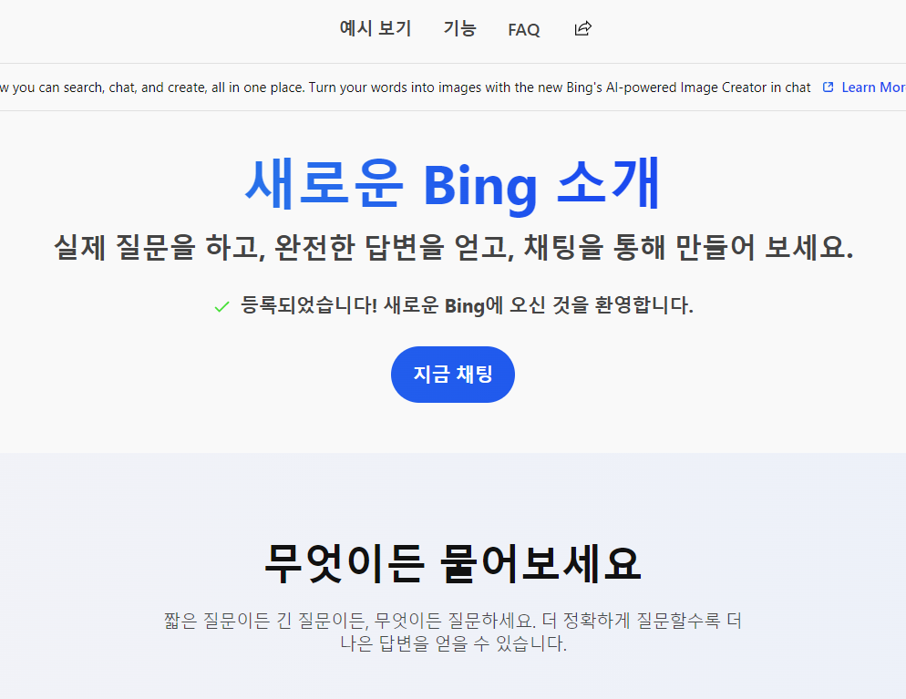 사용하기를 누르면 위와 같은 웹페이지로 접속하게 됩니다. 새로운 Bing이라는 것이 빙 챗봇을 의미하며 지금 채팅을 클릭하신 경우 바로 이용이 가능합니다.