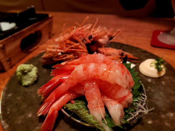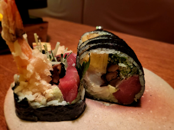 호미지의 대표메뉴로는 우설구이, 후토마끼, 아마에비 사시미가 있습니다. 우설구이는 소고기의 가장 부드러운 부위인 우설을 돌판에 구워낸 메뉴로, 레몬에 찍어 먹으면 입 안에서 살살 녹는 맛이 있습니다. 후토마끼는 굵게 만든 김초밥으로, 참치회, 아보카도, 새우튀김, 계란말이, 오이 등 다양한 재료가 들어가 있습니다. 한 입에 먹기에는 힘들 정도로 푸짐하고, 소스와 잘 어울려요. 아마에비 사시미는 단새우 회로, 새우의 달콤함과 쫄깃함이 느껴집니다. 몸은 사시미로 머리는 튀겨 주셔서 고추냉이와 함께 먹으면 더욱 맛있습니다.